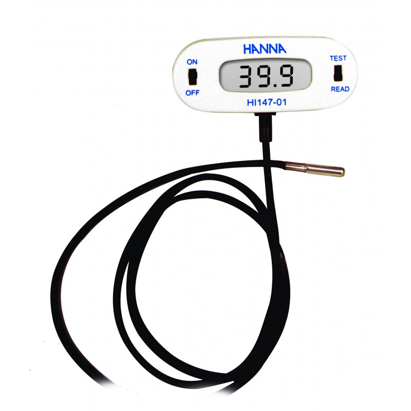 Thermomètre compact à fixation magnétique, avec sonde ambiance et 1 m de câble souple en silicone pour le contrôle continu des congélateurs et réfrigérateurs.