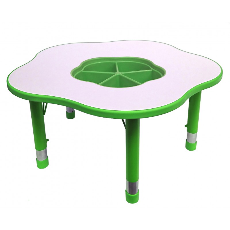 Le plateau est en mélaminé est assemblé sur 4 pieds en métal, réglable en hauteur de 40 à 60 cm. Disposant de 5 côtés de 90 cm, les coins sont arrondis. Ceci procure un maximum de sécurité à l’enfant. Un bac avec plusieurs compartiments est installé au milieu de la table pour les rangements des affaires.